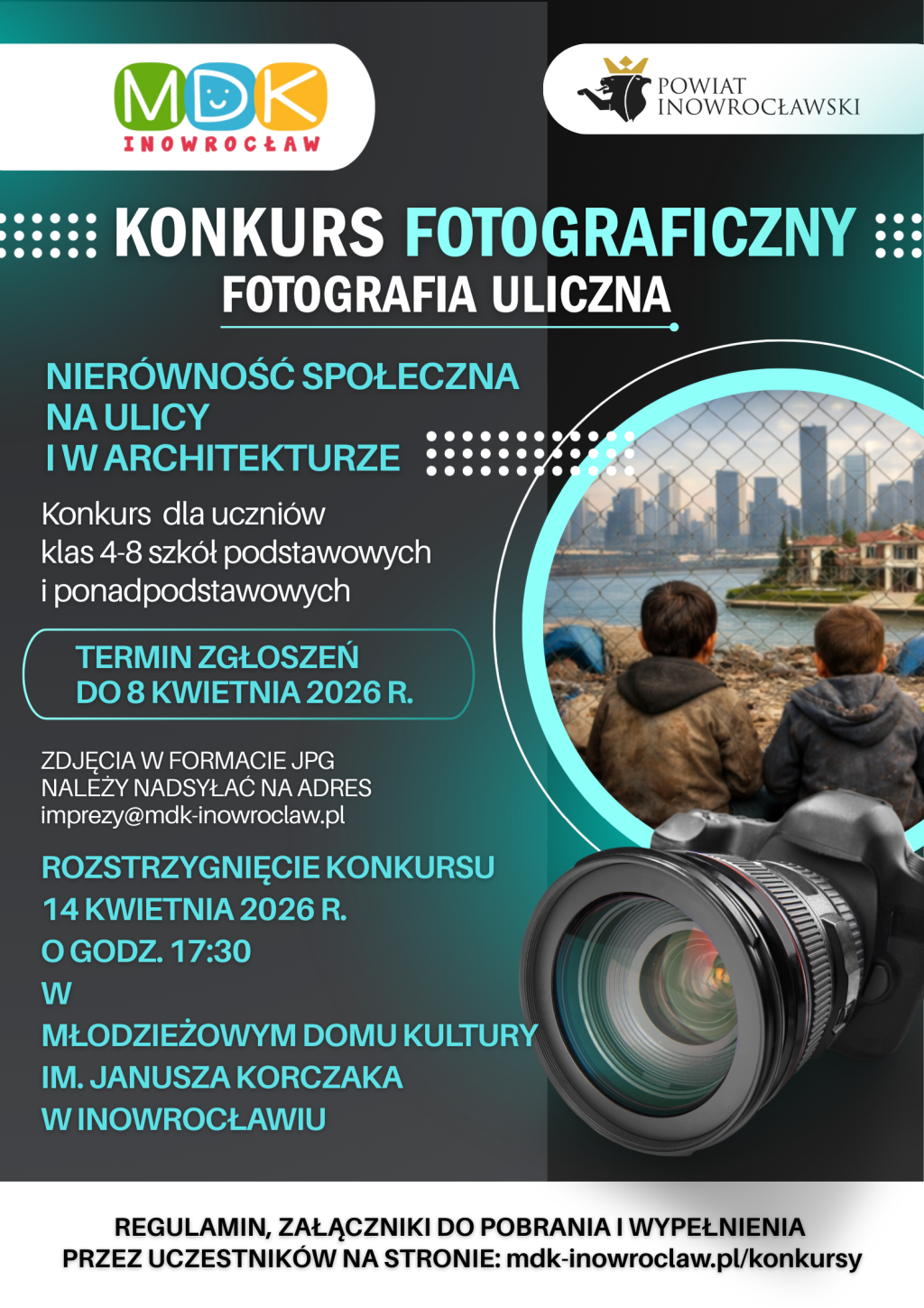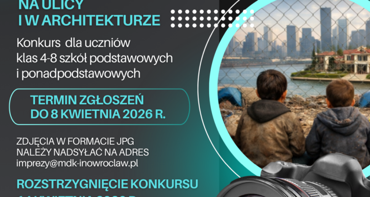 Młodzieżowy Dom Kultury w Inowrocławiu zaprasza uczniów klas IV–VIII szkół podstawowych oraz szkół ponadpodstawowych do udziału w konkursie fotograficznym pod hasłem „Fotografia uliczna – Nierówność społeczna na ulicy i w architekturze”. Celem konkursu jest zachęcenie młodych ludzi do uchwycenia w obiektywie problemu nierówności społecznych widocznych w przestrzeni miejskiej.