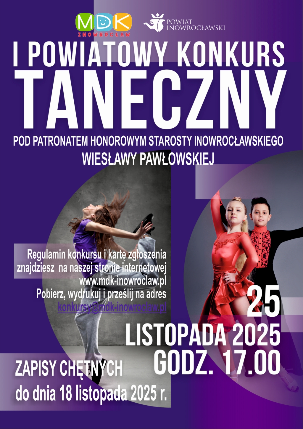 Młodzieżowy Dom Kultury im. Janusza Korczaka w Inowrocławiu zaprasza dzieci i młodzież z całego powiatu inowrocławskiego do udziału w I Powiatowym Konkursie Tanecznym, który odbędzie się 25 listopada 2025 r. o godz. 17:00 w siedzibie MDK przy ul. NMP 14-16.