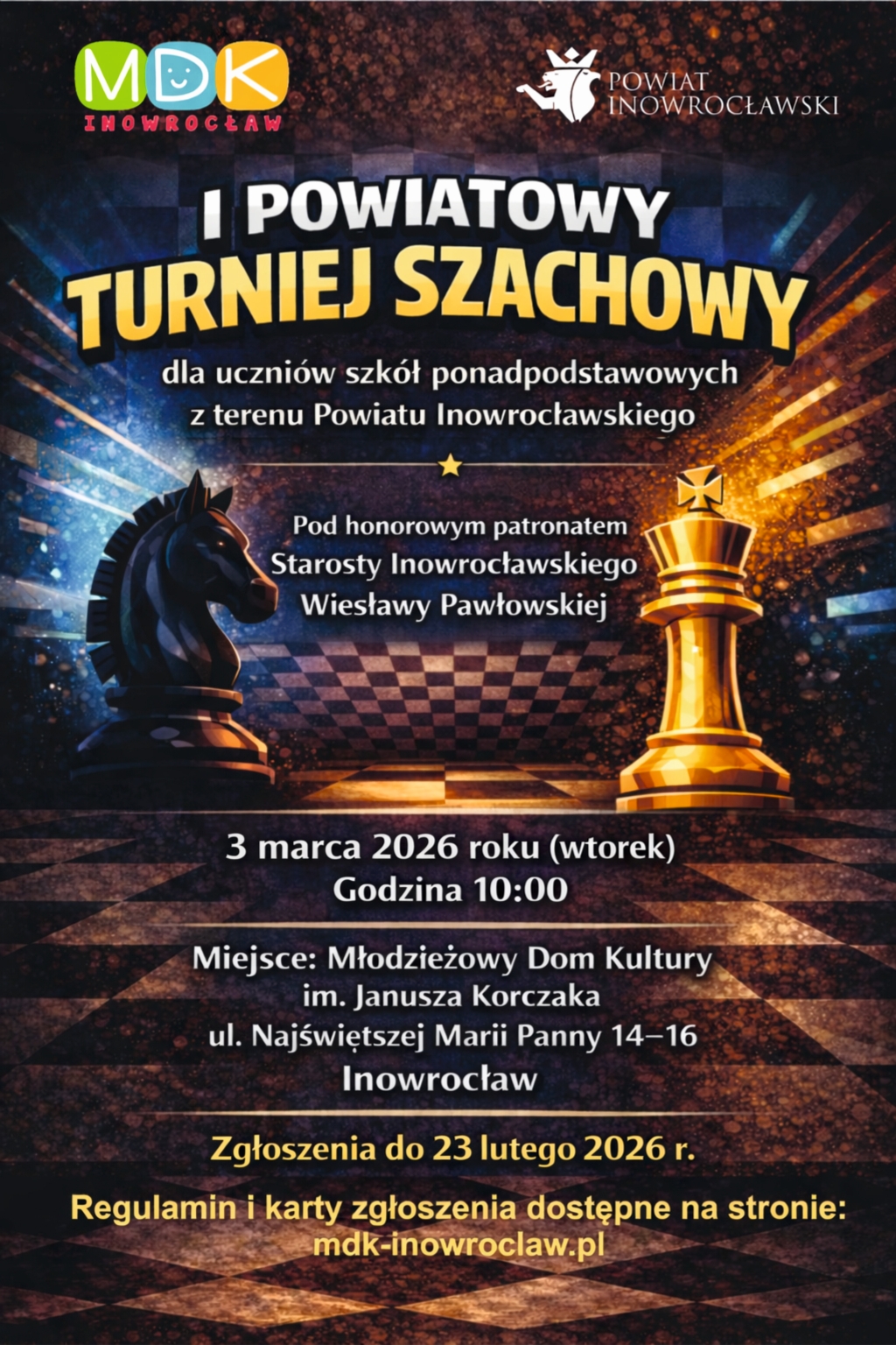 Młodzieżowy Dom Kultury im. Janusza Korczaka w Inowrocławiu zaprasza uczniów szkół ponadpodstawowych z terenu Powiatu Inowrocławskiego do udziału w I Powiatowym Turnieju Szachowym. Rozgrywki odbędą się 3 marca 2026 roku o godzinie 10:00 w siedzibie MDK przy ul. Najświętszej Marii Panny 14–16 w Inowrocławiu.